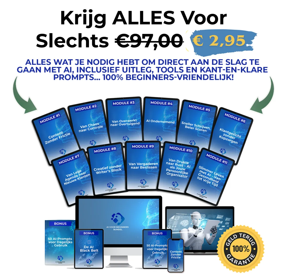 Geen probleem! Je bent beschermd door onze 21 dagen geld-terug-garantie. Krijg vandaag nog toegang tot de "AI Voor Beginners Bundel" en probeer het zelf. Als het je om welke reden dan ook niet bevalt, laat het ons weten. We storten dan je geld terug, zonder vragen te stellen.